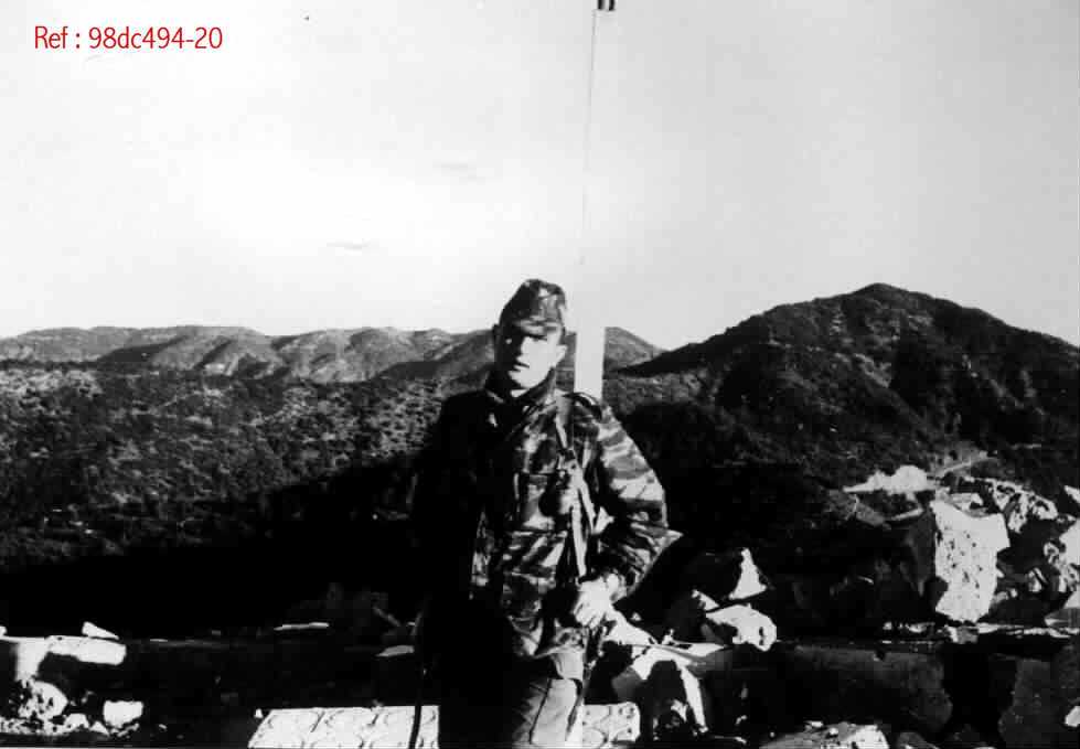 Un homme en tenue militaire debout devant un paysage montagneux.