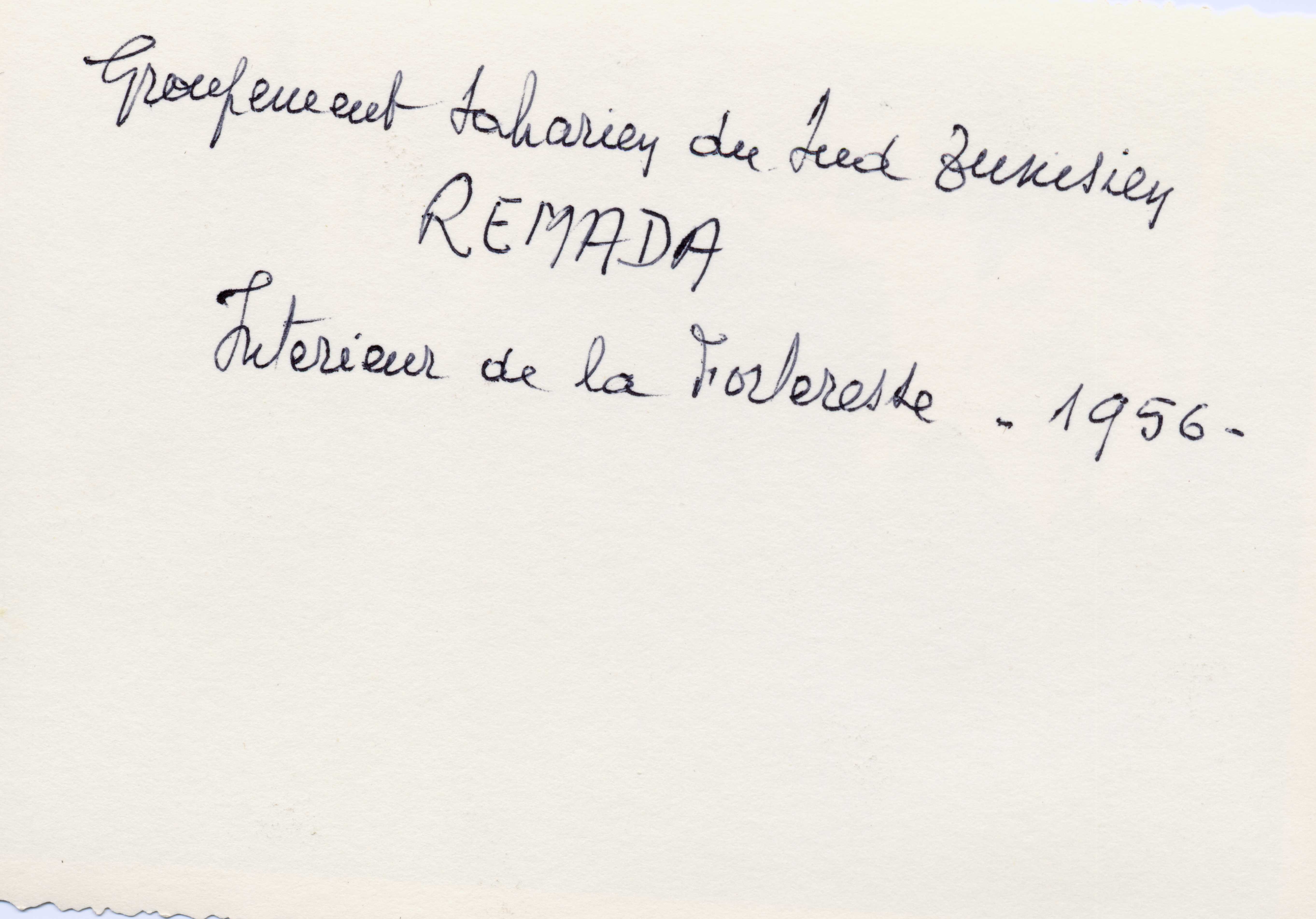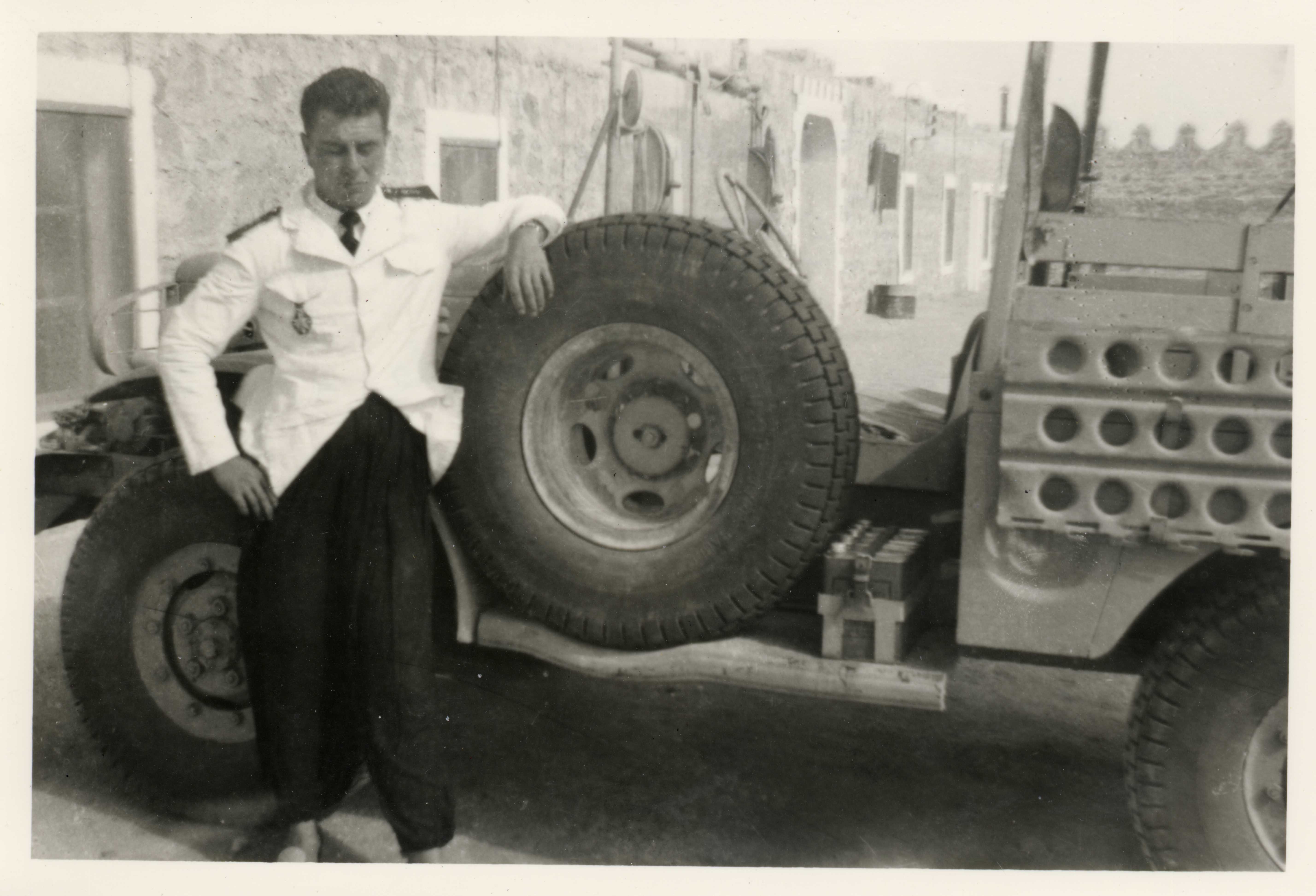 Un homme pose devant un véhicule militaire dans la forteresse de Remada en 1956