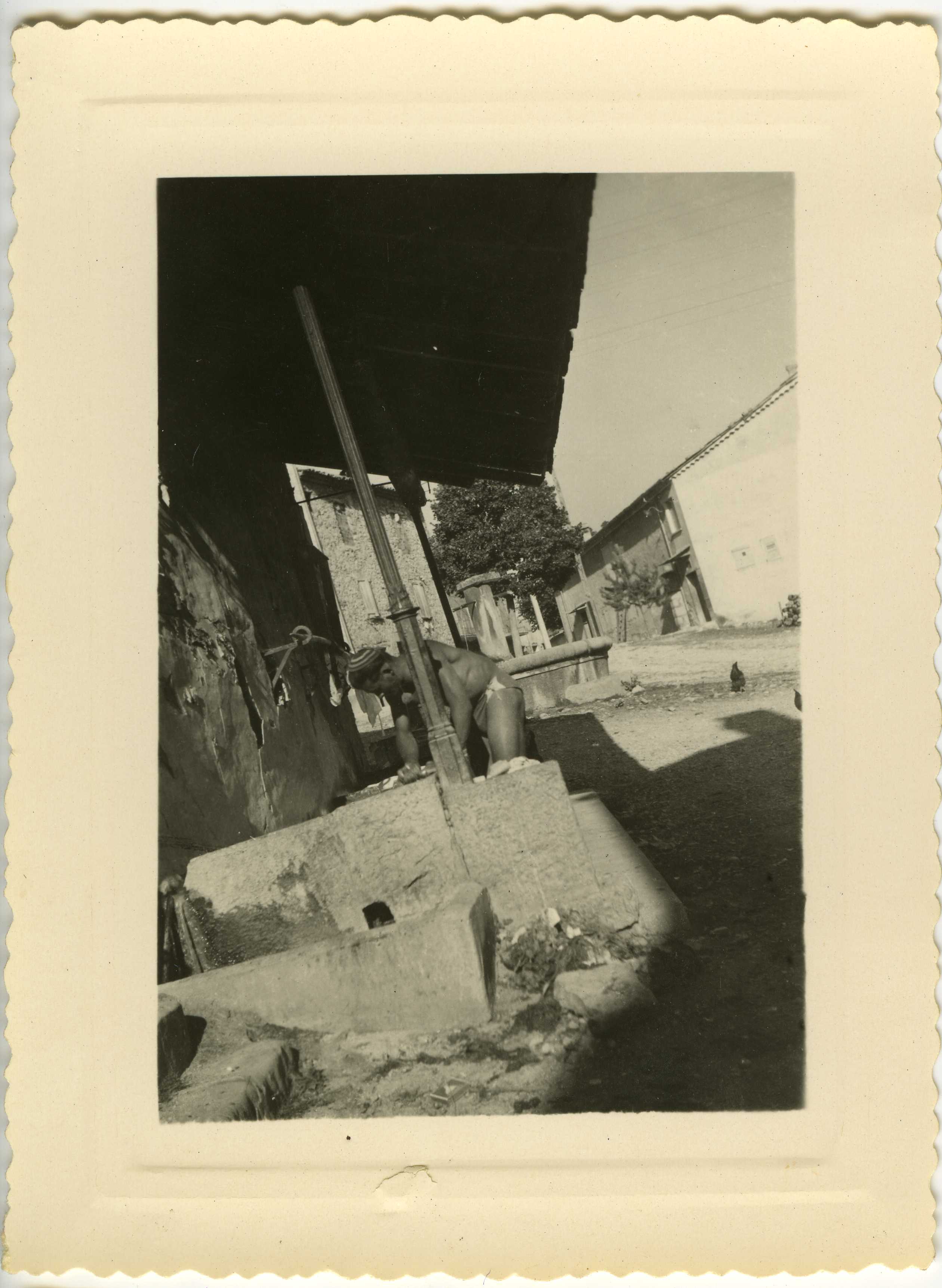 Un homme torse nu, en short ou sous-vêtement, qui se lave ou puise de l’eau à une fontaine publique en pierre. En arrière-plan, on distingue des maisons traditionnelles avec murs en pierre ou enduits et toits en tuiles.