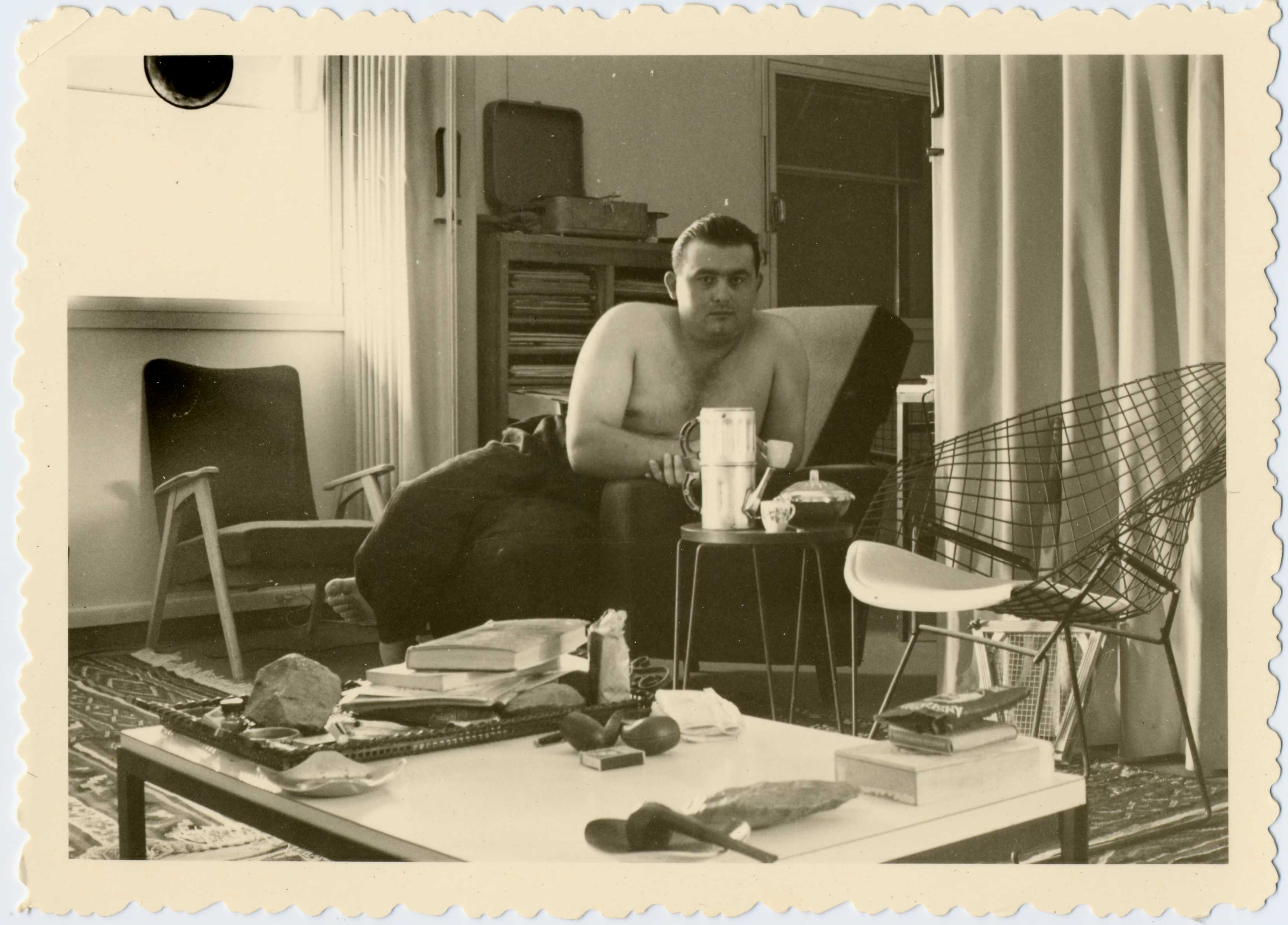 Un homme torse nu dans un salon