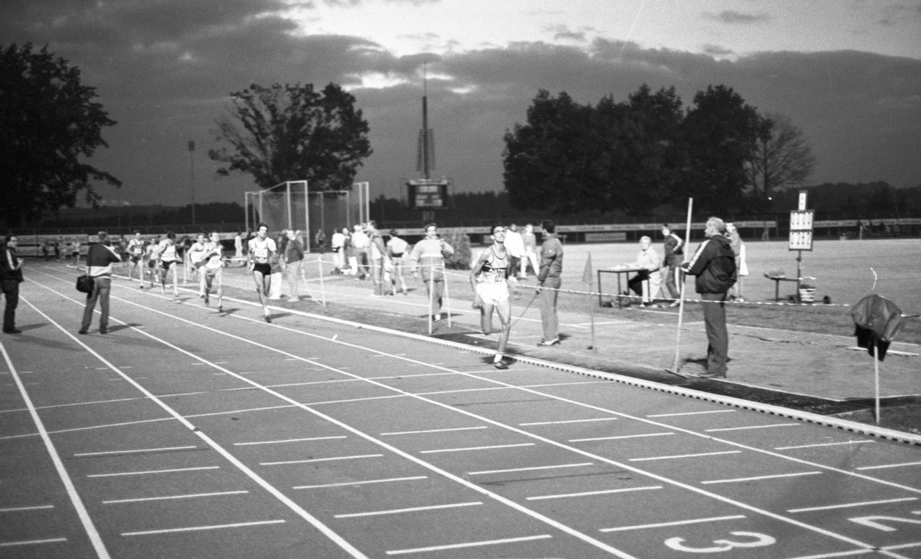 Les sportifs de l'épreuve de course de fond s'affrontent lors d'un meeting d'athlétisme au stade du Palais des Sports de Beaublanc à Limoges, en juillet 1988.