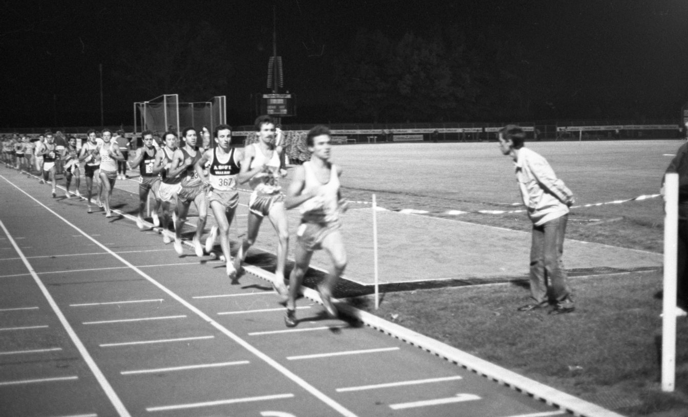 Les sportifs de l'épreuve de course de fond s'affrontent lors d'un meeting d'athlétisme au stade du Palais des Sports de Beaublanc à Limoges, en juillet 1988.