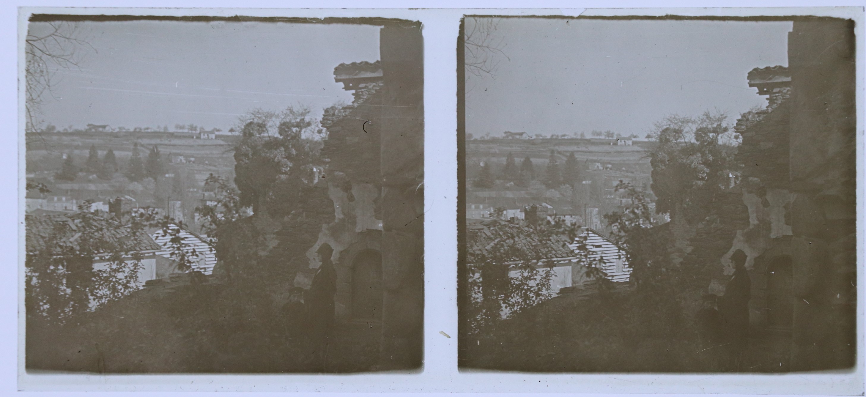 Une femme et un jeune garçon près des ruines d'un village dans les années 1920.