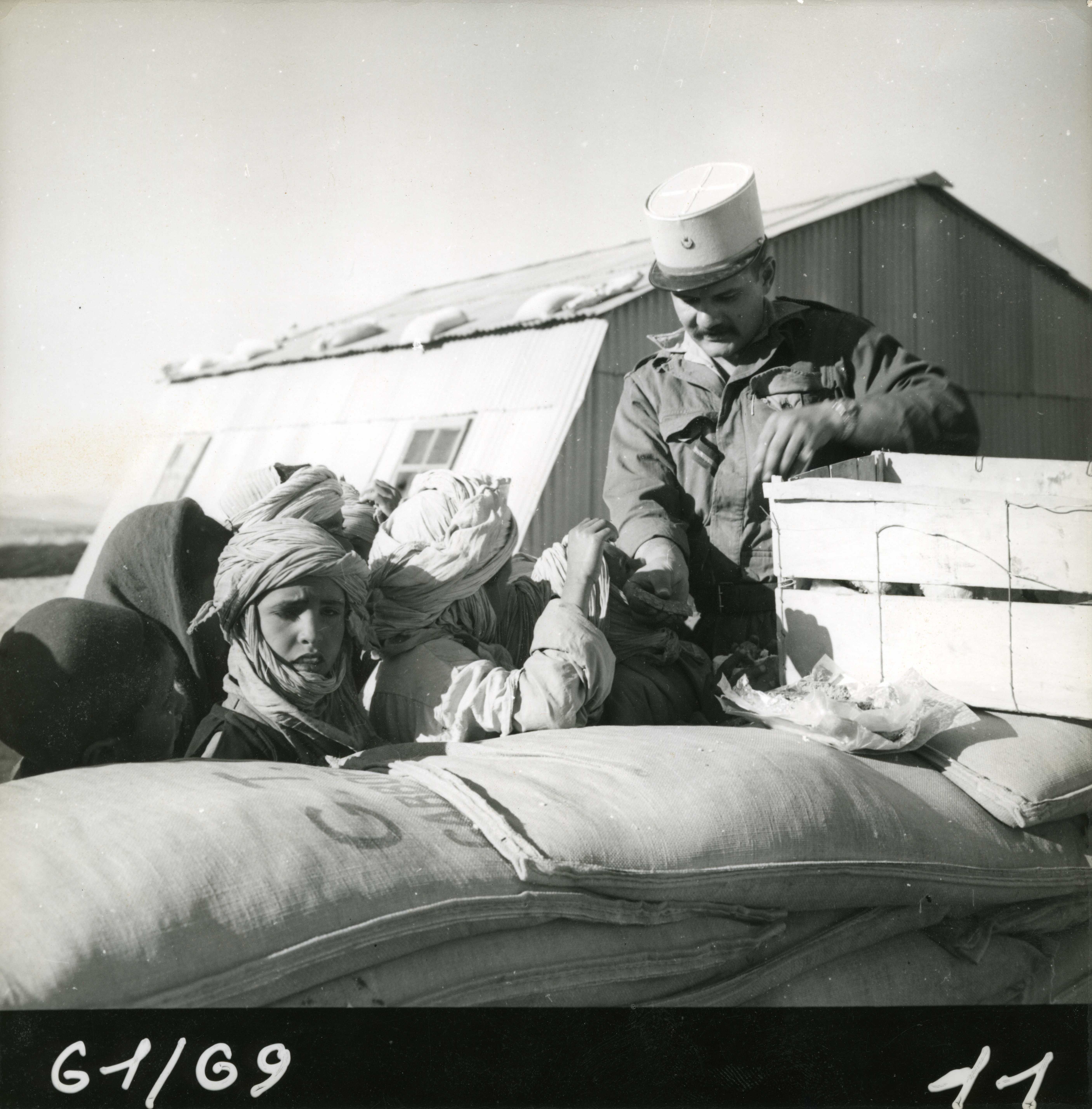 Un soldat français offre de la nourriture à de jeunes bédouins en 1958