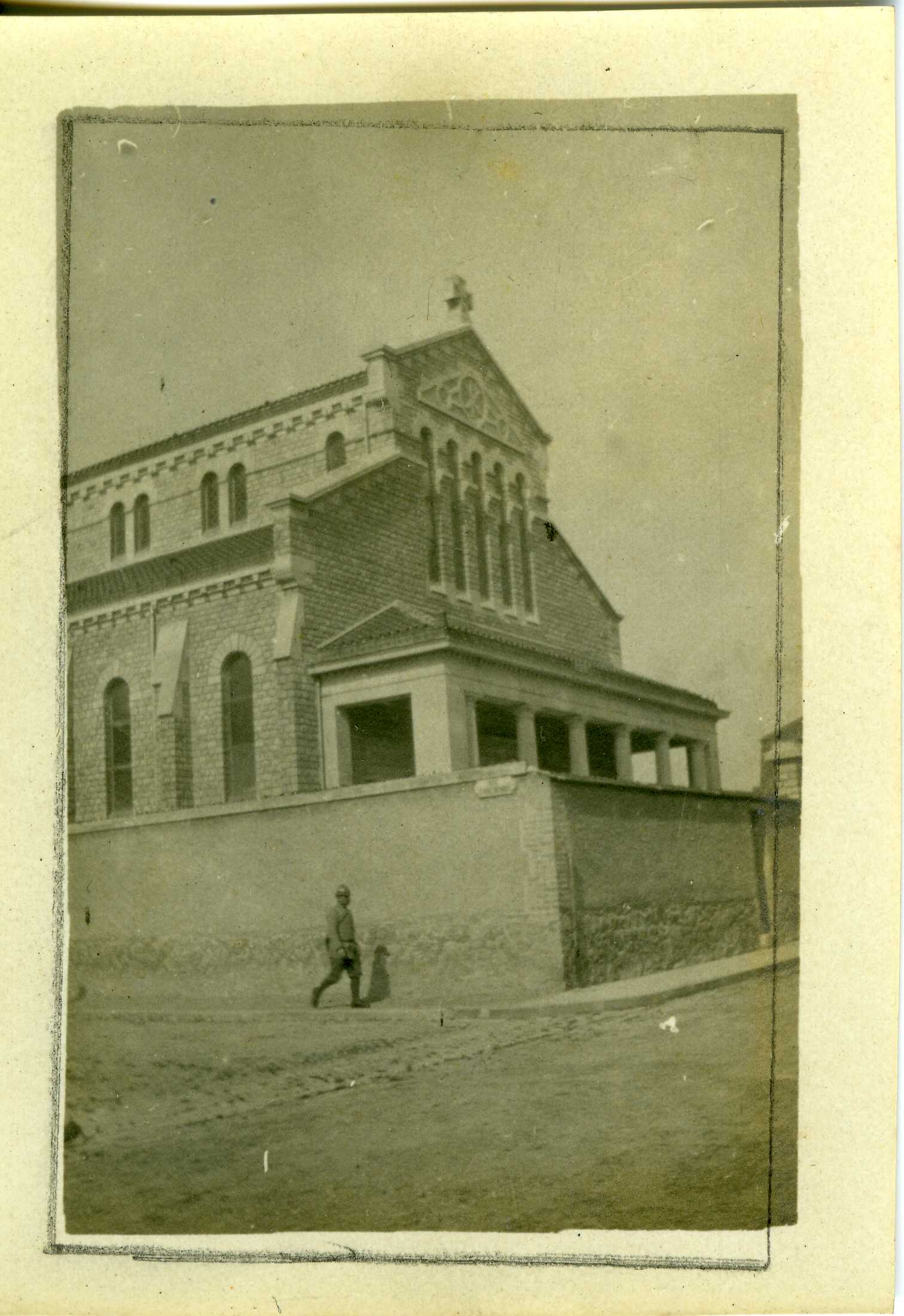Un soldat longe un bâtiment religieux pendant la Première Guerre mondiale