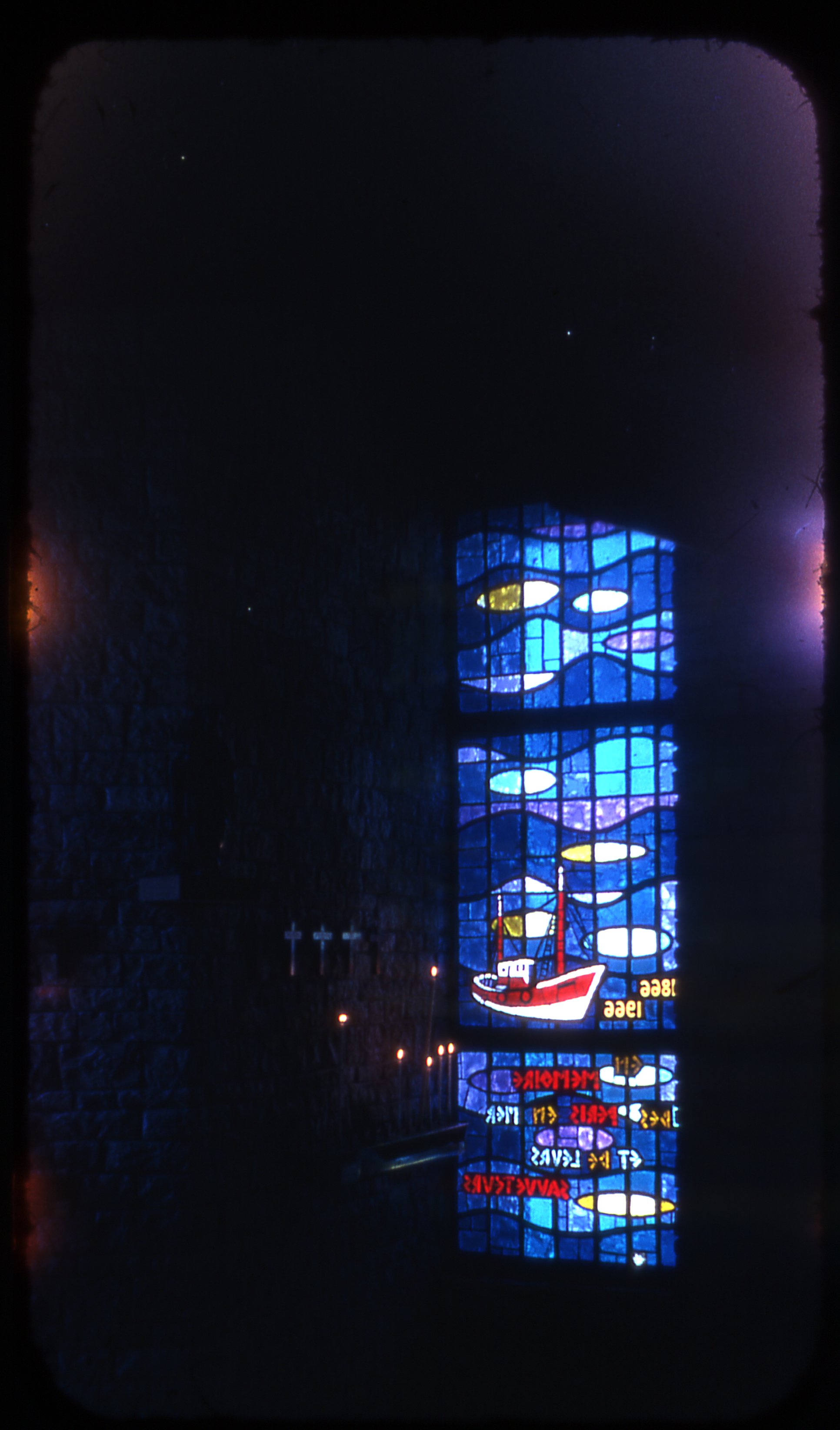 Un vitrail de la Chapelle Notre-Dame à la Cotinière sur l'Île d'Oléron dans les années 1960-1970.