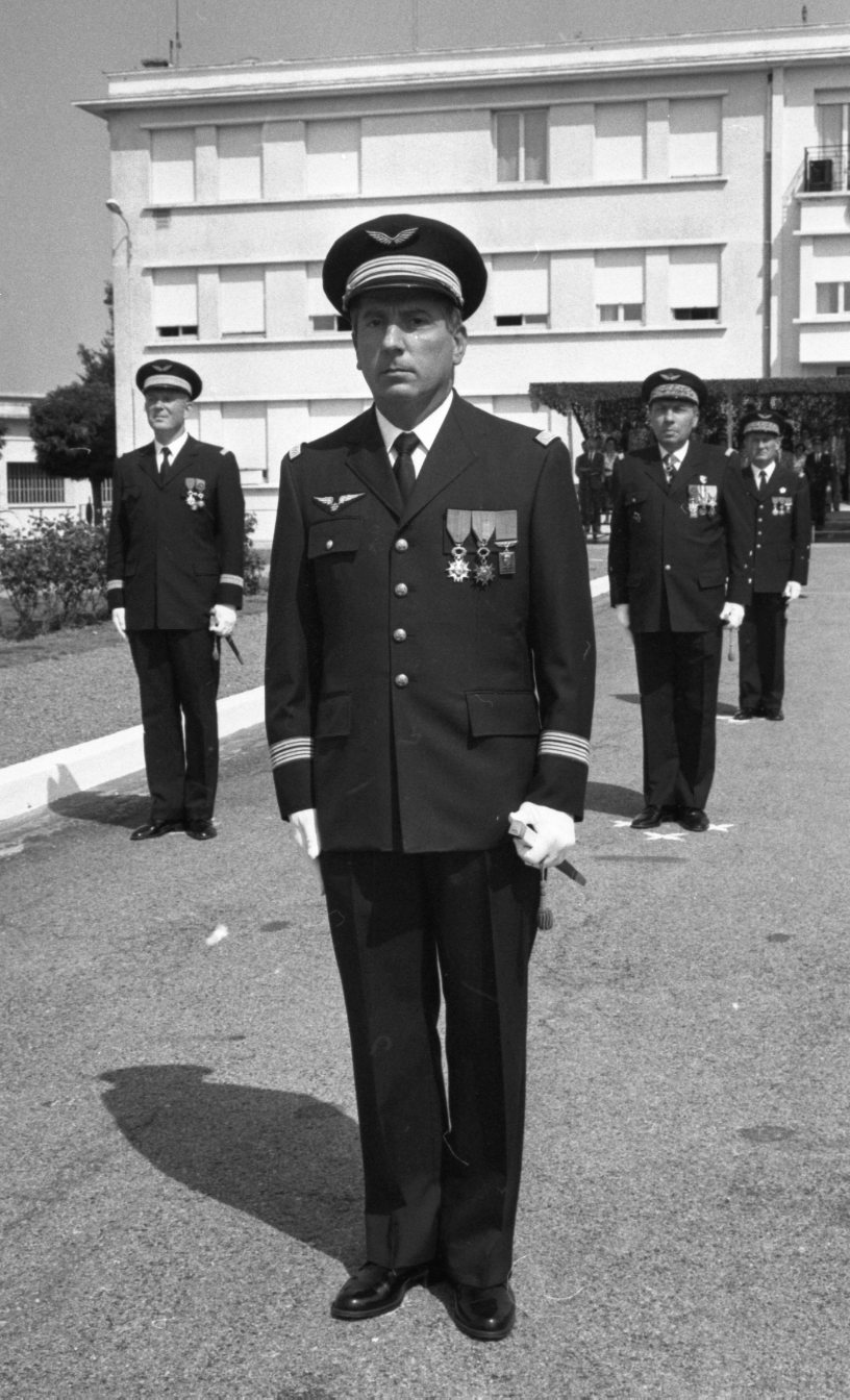 Des officiers et un militaire lors d'une prise de commandement à la base aérienne de Romanet à Limoges, en août 1991.