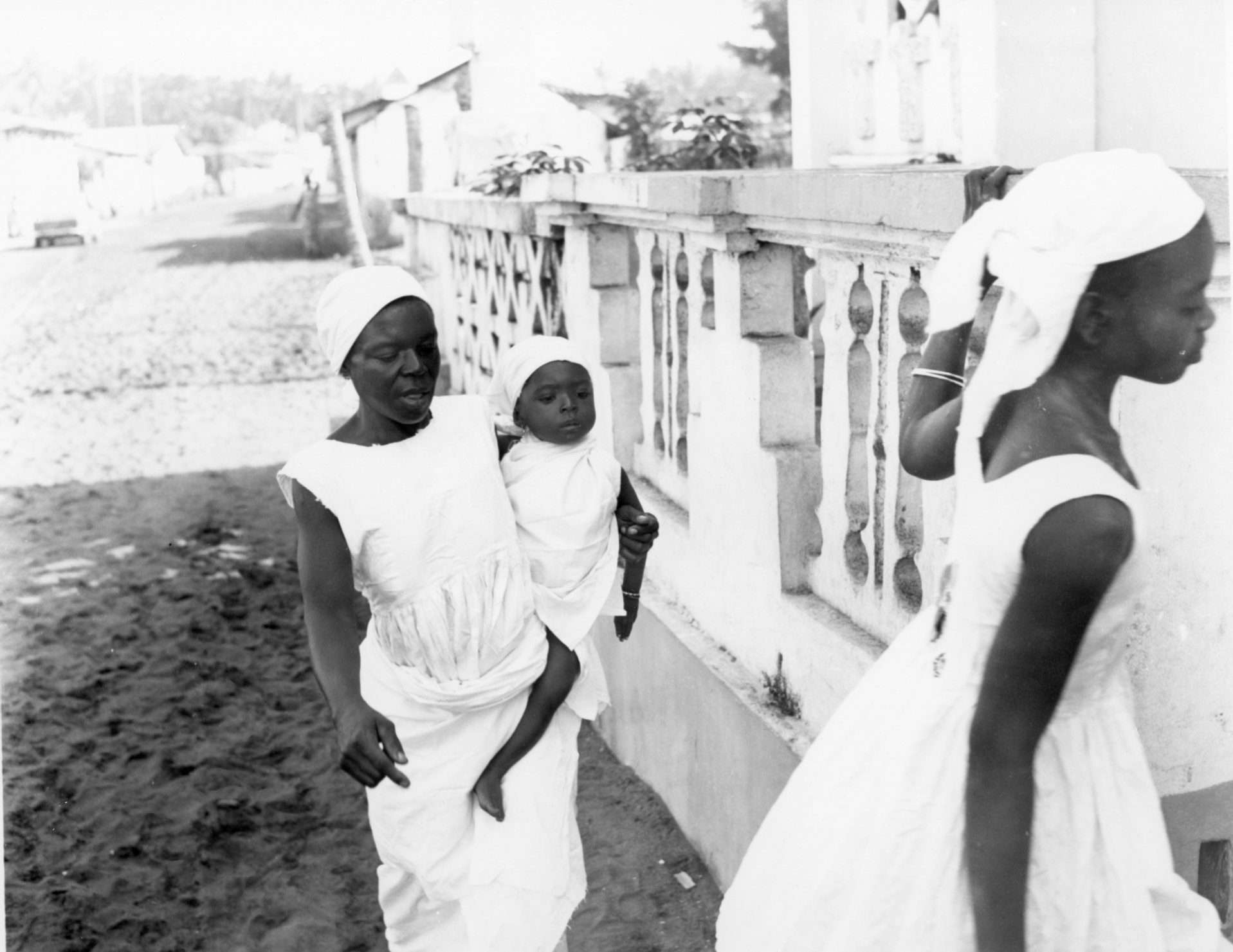 En Côte d'Ivoire, des femmes entrent dans une église pour assister une un office harriste, dans les années 1970.