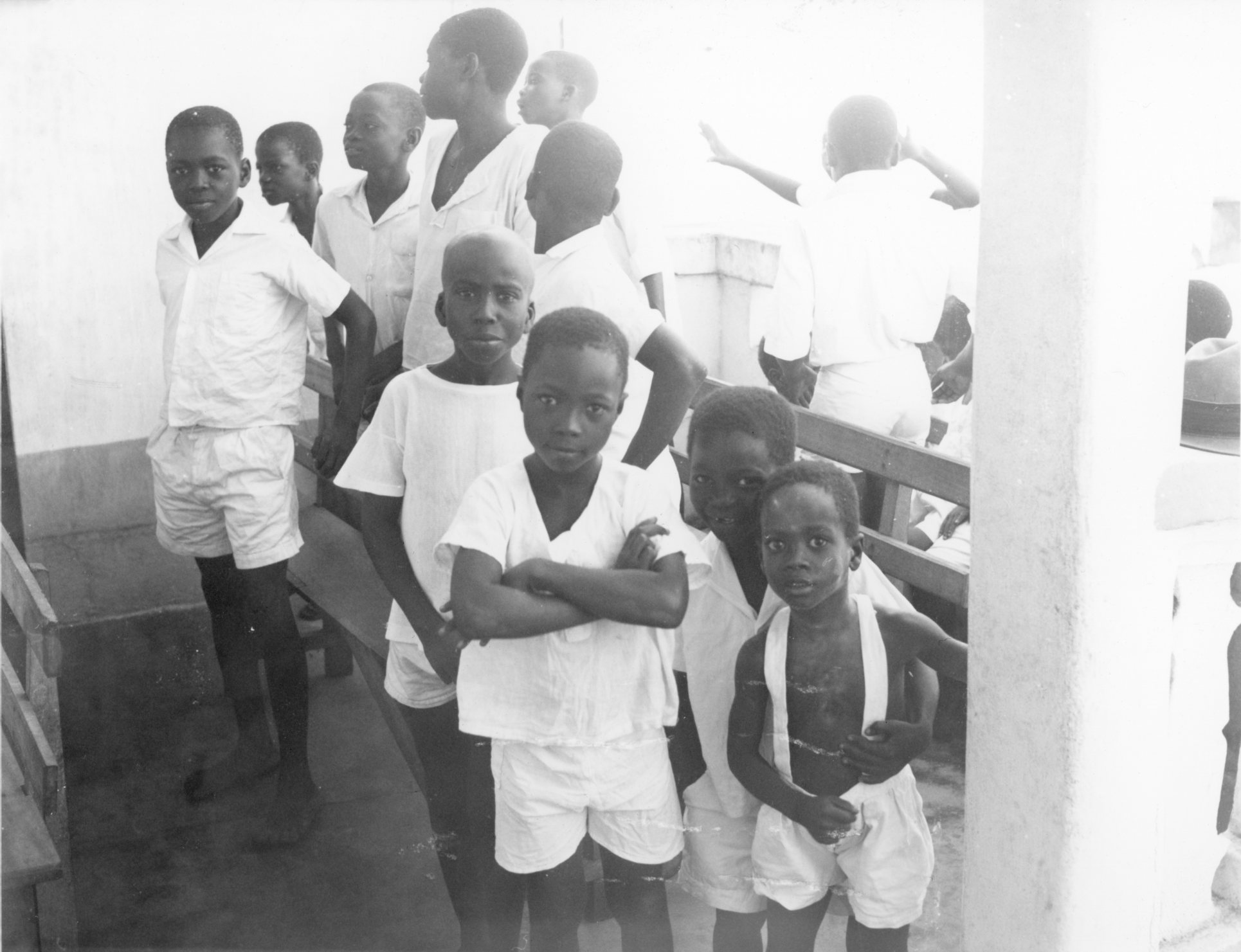 Des jeunes garçons attendent sous le porche d'une église harriste, en Côte d'Ivoire, dans les années 1970.