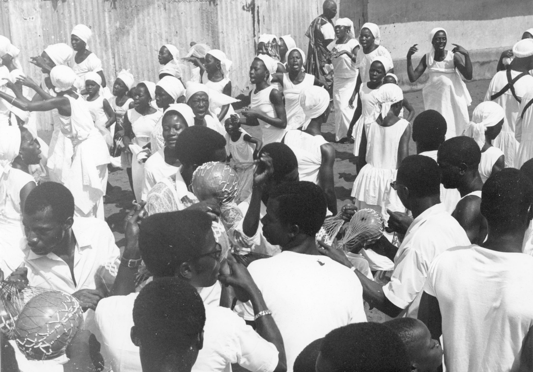 Lors d'une cérémonie harriste, des femmes dansent et des hommes jouent de la musique, dans une rue de Côte d'Ivoire, dans les années 1970.