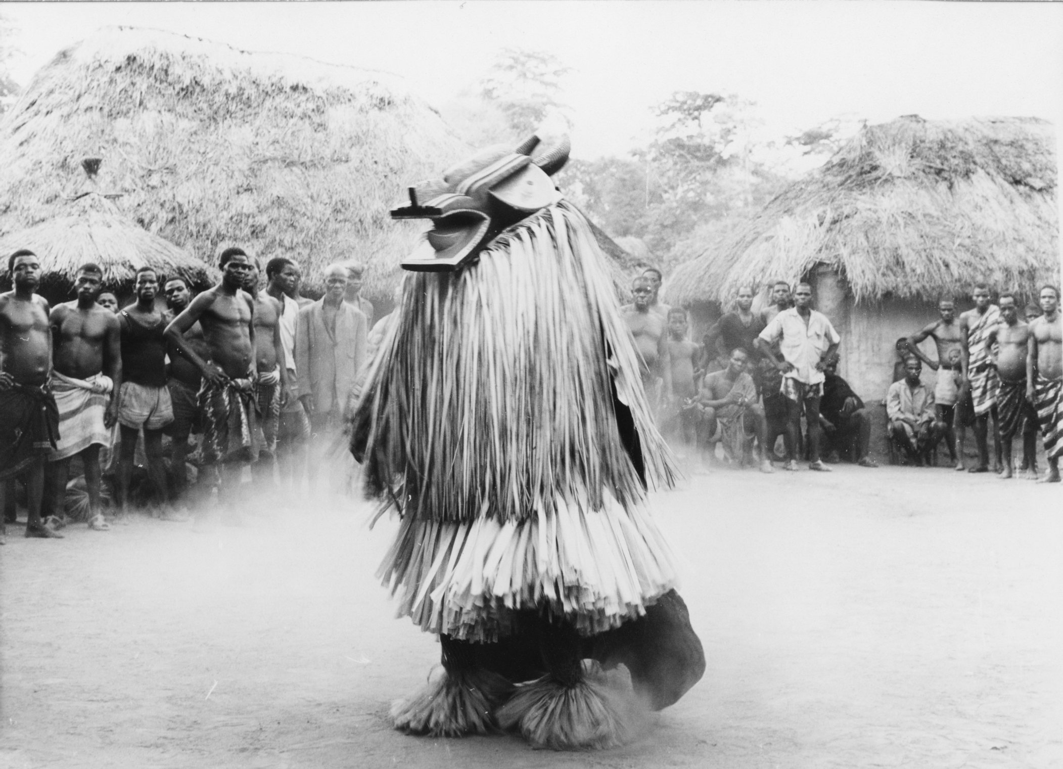 Le Goli effectue une danse traditionnelle sous les yeux des habitants baoulés, dans un village ivoirien, dans la seconde moitié du XXème siècle.