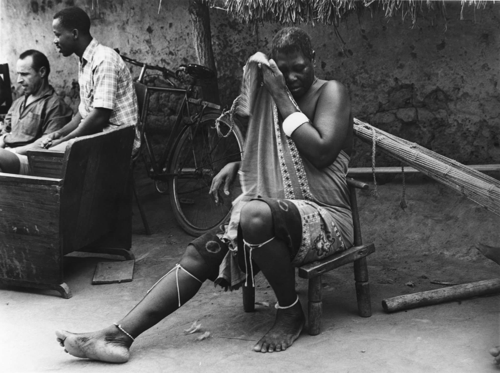 Un des porteurs du masque de Goli prend quelques instants de repos après son passage dans un village baoulé, en Côte d'Ivoire, dans la seconde moitié du XXème siècle.