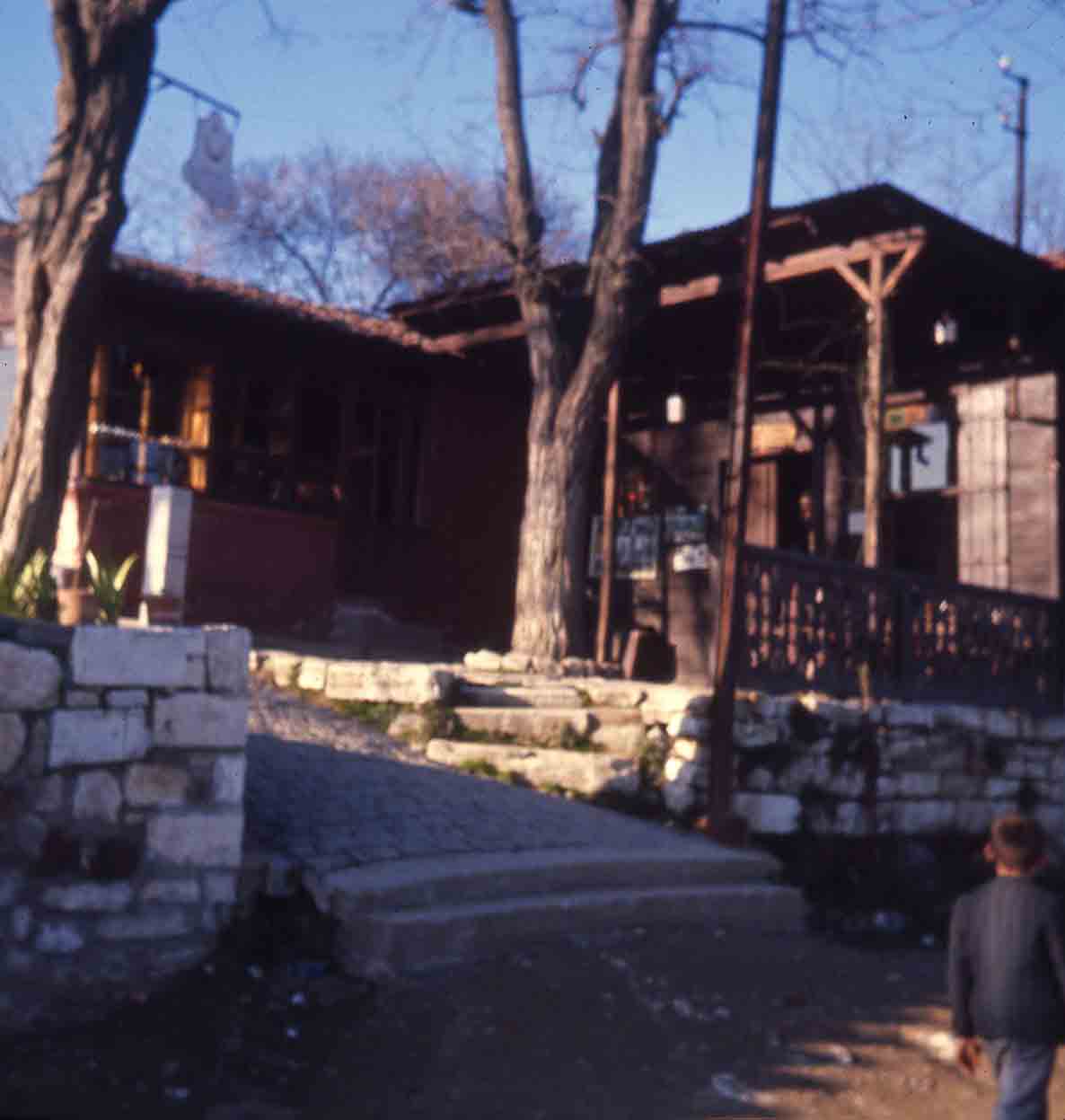 Prise de vue d'une maison, à Istanbul. Majoritairement en bois, mur en pierre.