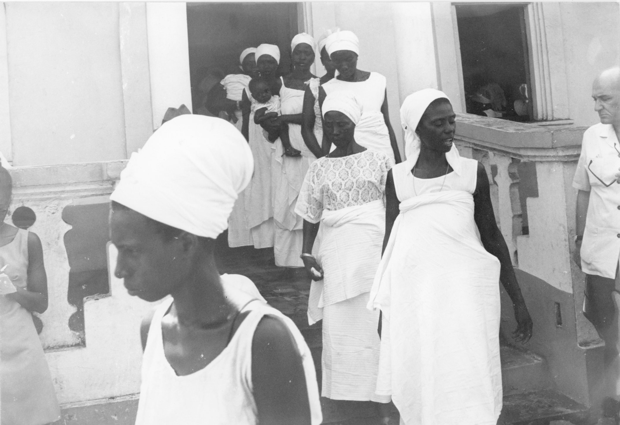 Après l'office, des femmes sortent d'une église harriste en Côte d'Ivoire, dans les années 1970.
