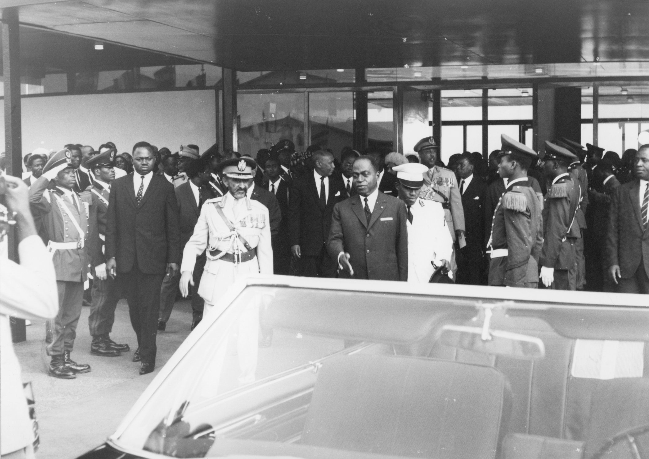 Lors de sa visite en Côte d'Ivoire, le roi d'Ethiopie Haïlé Séllasié Ier est reçu par le Président ivoirien Félix Houphouët-Boigny, des officiels et l'armée, à l'aéroport d'Abidjan, en 1965.