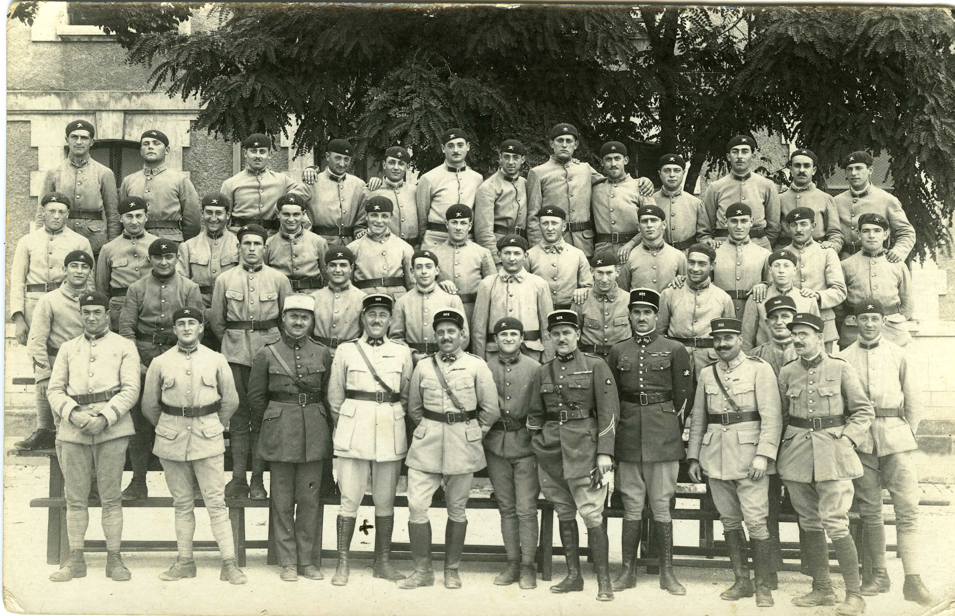 Unité d’artillerie française, avec un mélange de soldats du rang et d’officiers Sur la tête, presque tous portent le bonnet de police (calot), souvent orné de l’insigne d’arme brodé. Ici, on voit des bombardes croisées. Cela identifie clairement une unité d’artillerie. Photo prise devant un bâtiment de caserne, typique des prises de vue collectives de compagnies ou sections.