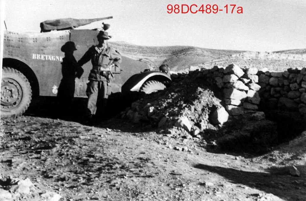 Véhicule blindé à l’arrêt, avec un soldat à côté dans un paysage aride, typique de l’Afrique du Nord.