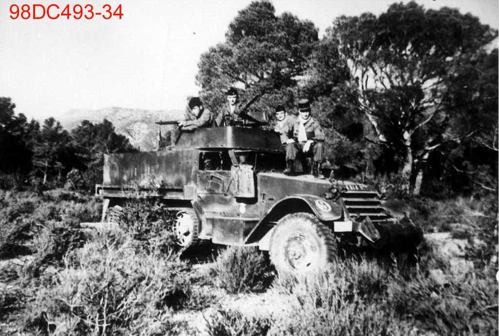 Quatre hommes y sont à bord dans un terrain qui ressemble à la garigue mais cela peut être en Algérie.
