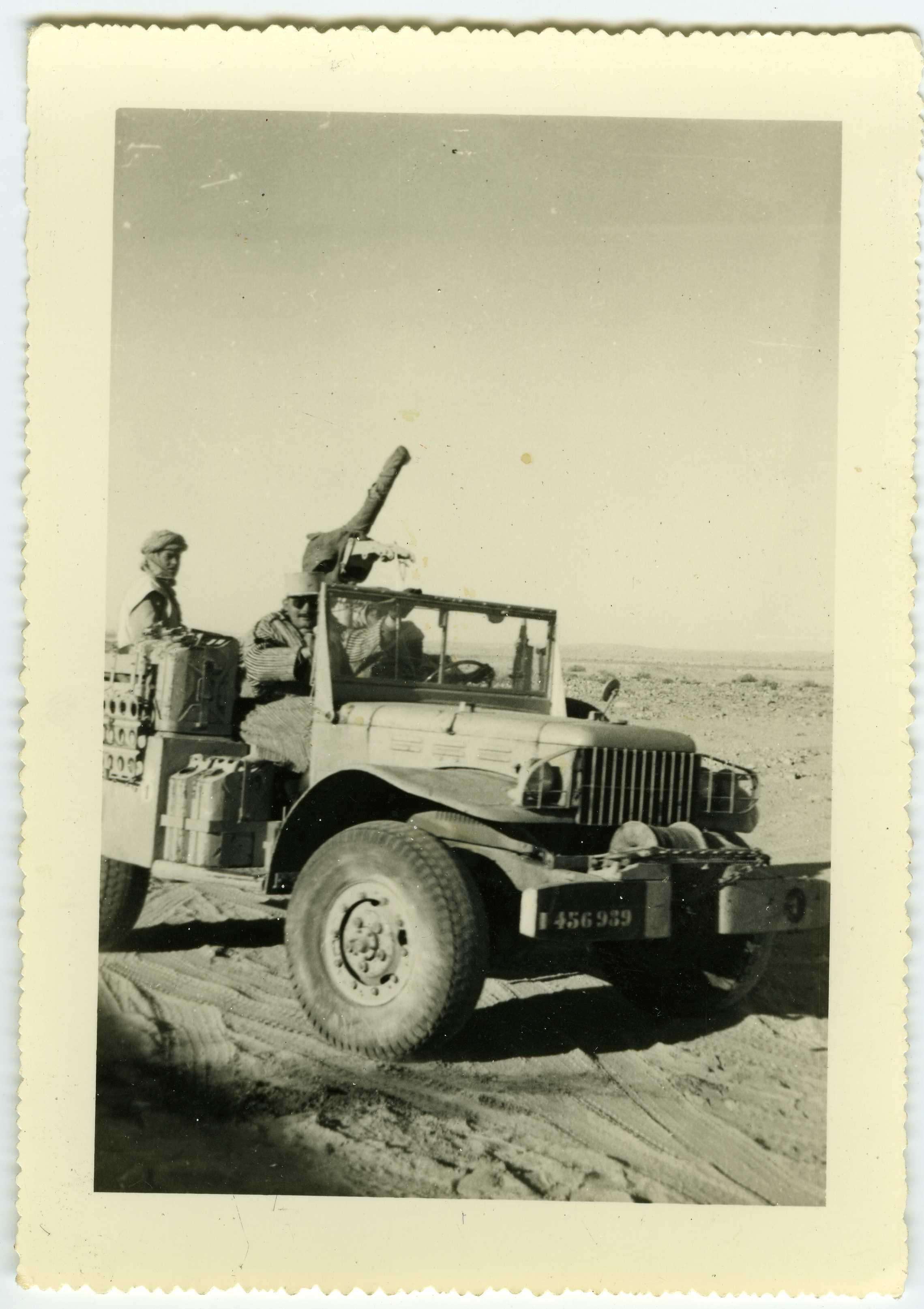 Véhicule militaire dans le désert (Afrique du Nord ?) où se trouvent deux légionnaires français.
