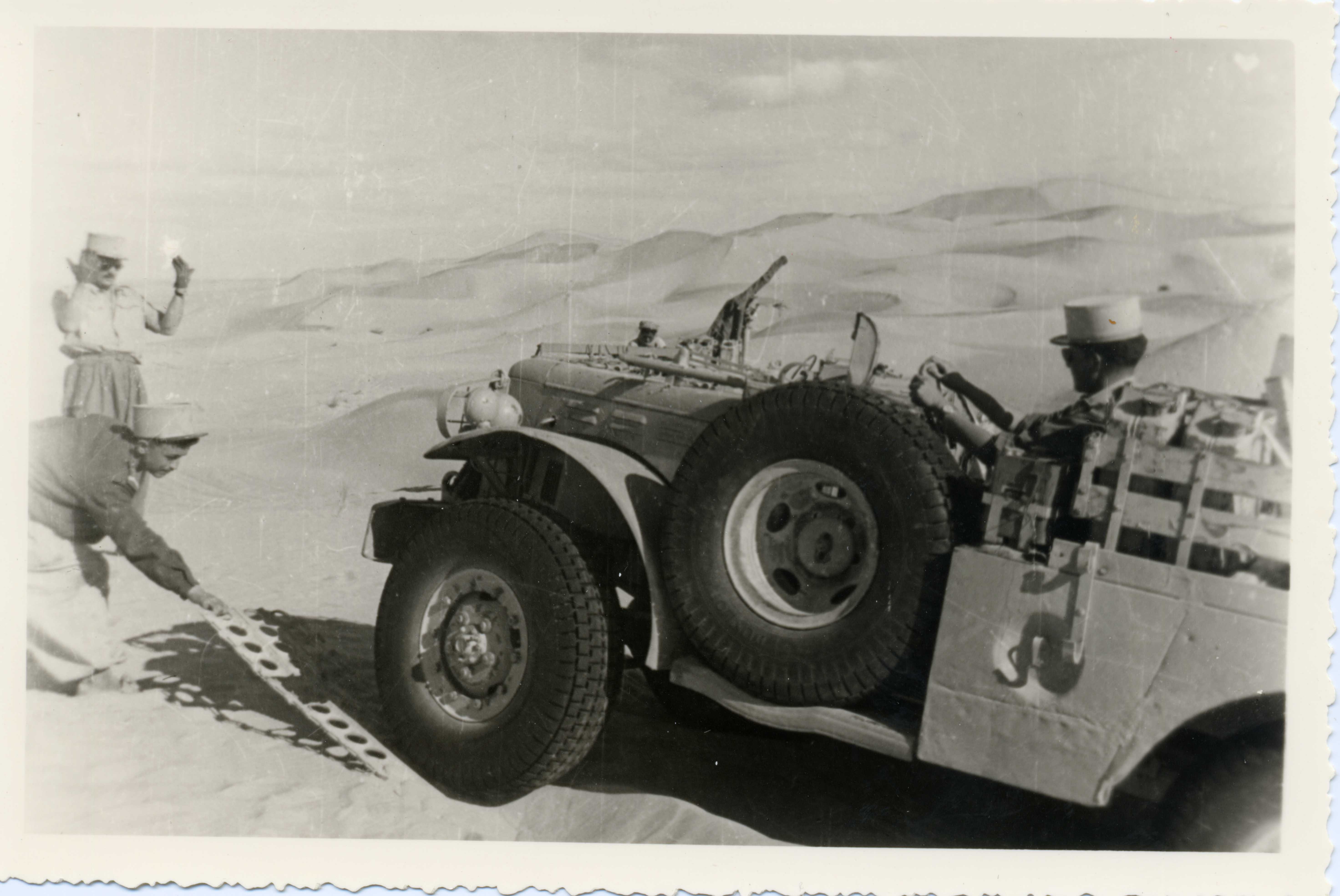 Véhicule militaire ensablé dans le désert près de l'ERG tunisien. Un légionnaire guide le chauffeur pour sortir du sable et un petit garçon glisse une plaque de dessablage.
