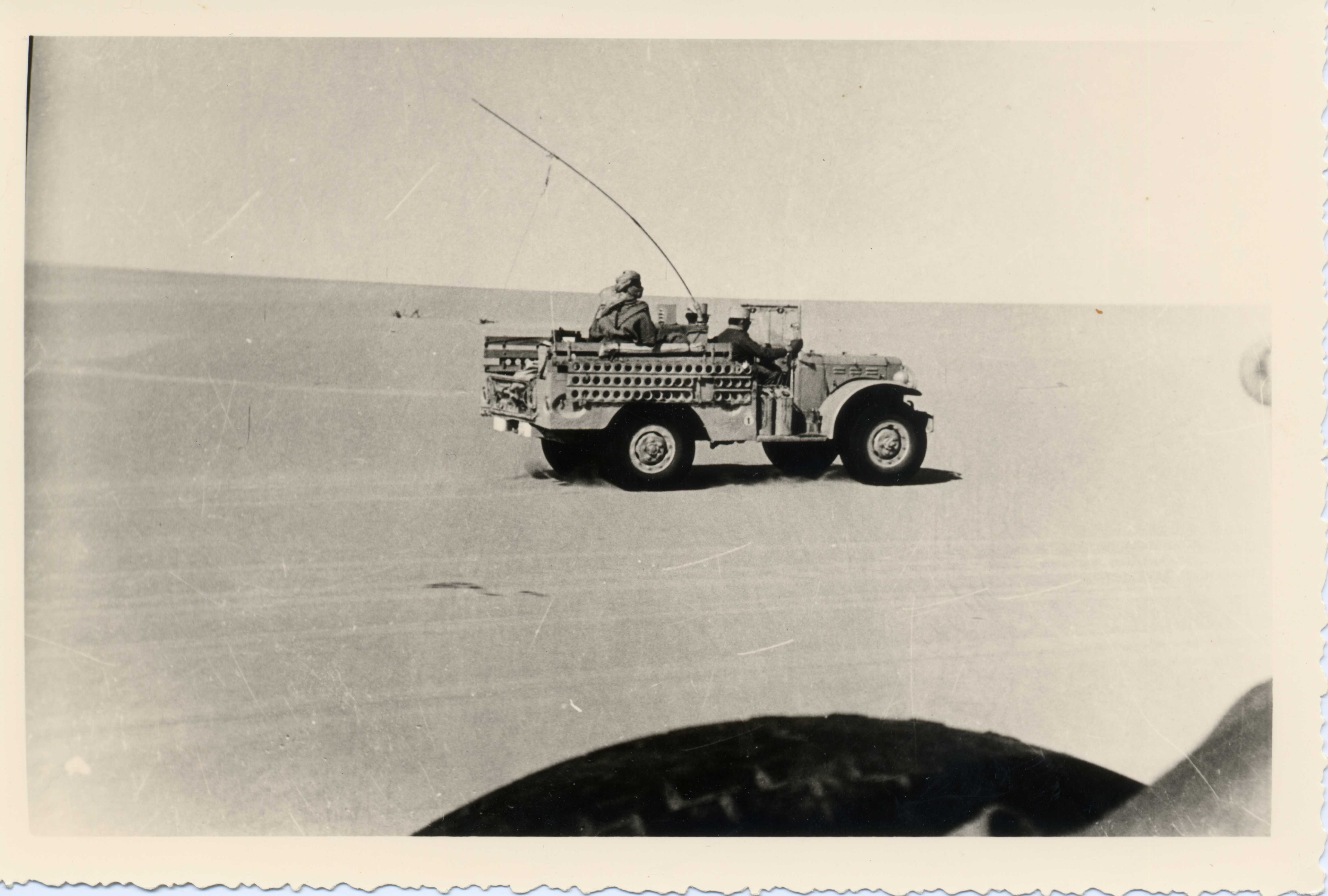 Véhicule militaire roulant dans le désert près de Remada. A son bord deux légionnaires et un bédouin