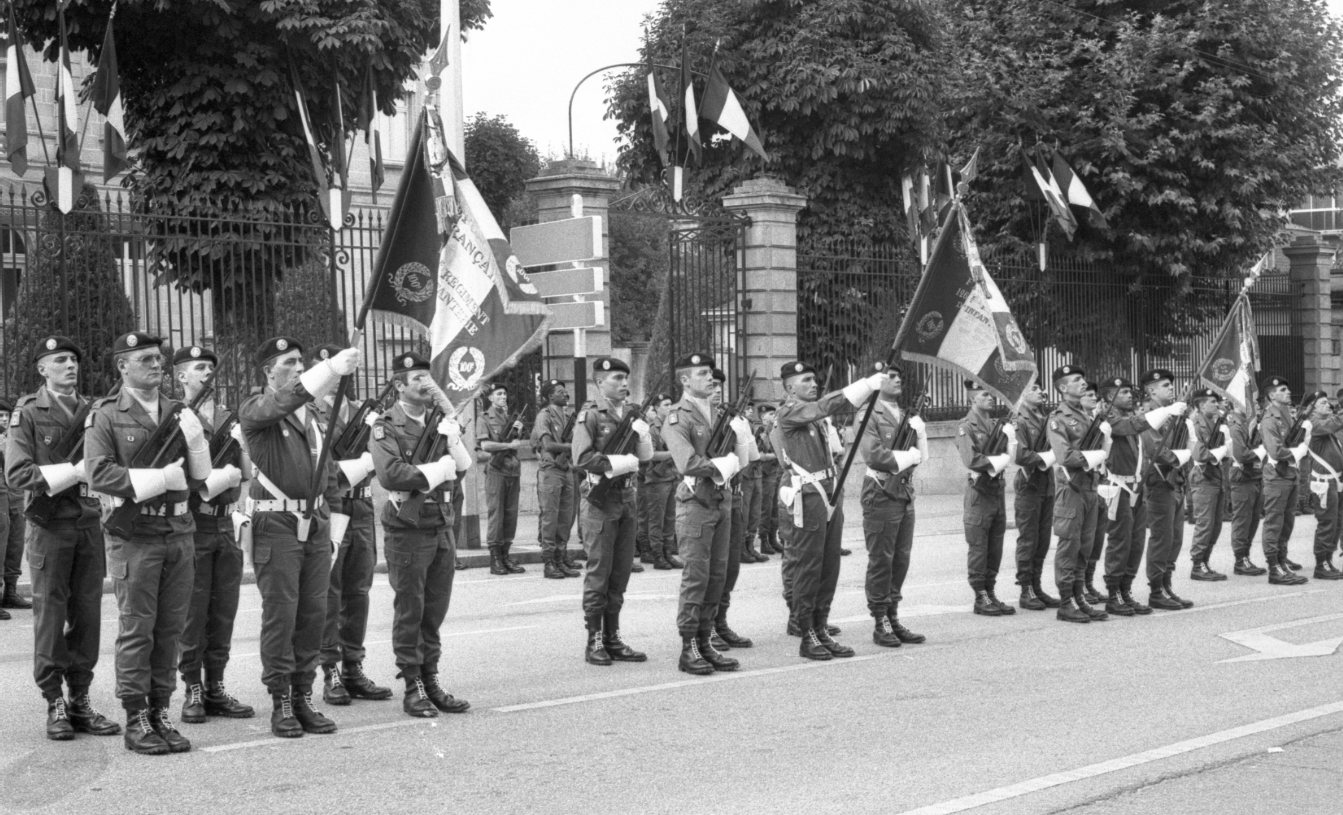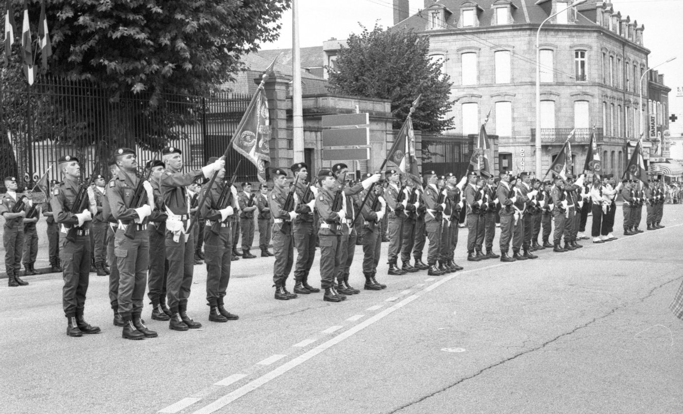Des militaires sont en formation pendant une prise d'armes, place Jourdan à Limoges, en août 1990.