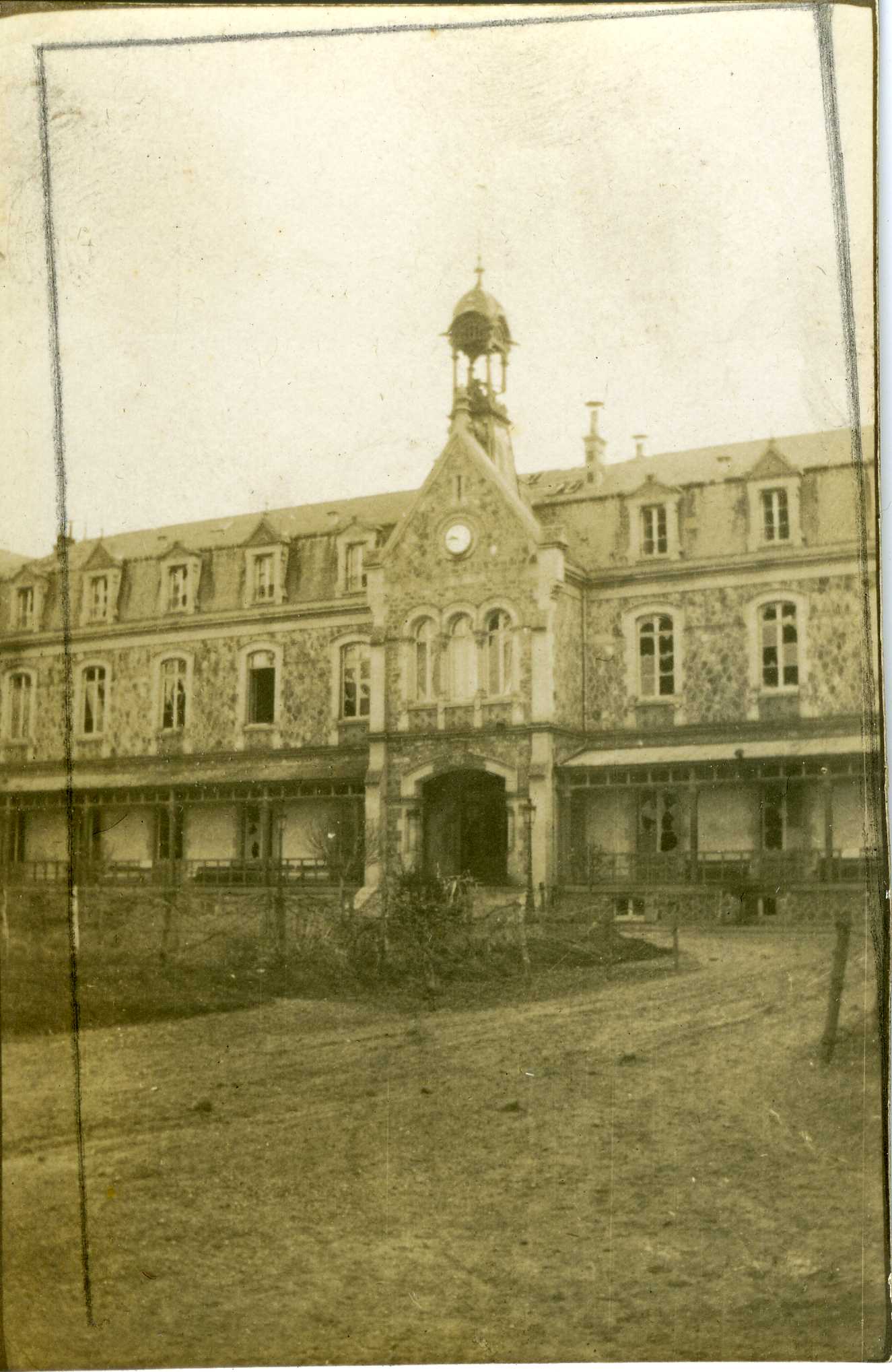 Vieux bâtiment aux vitres cassées pendant la Première Guerre mondiale.
