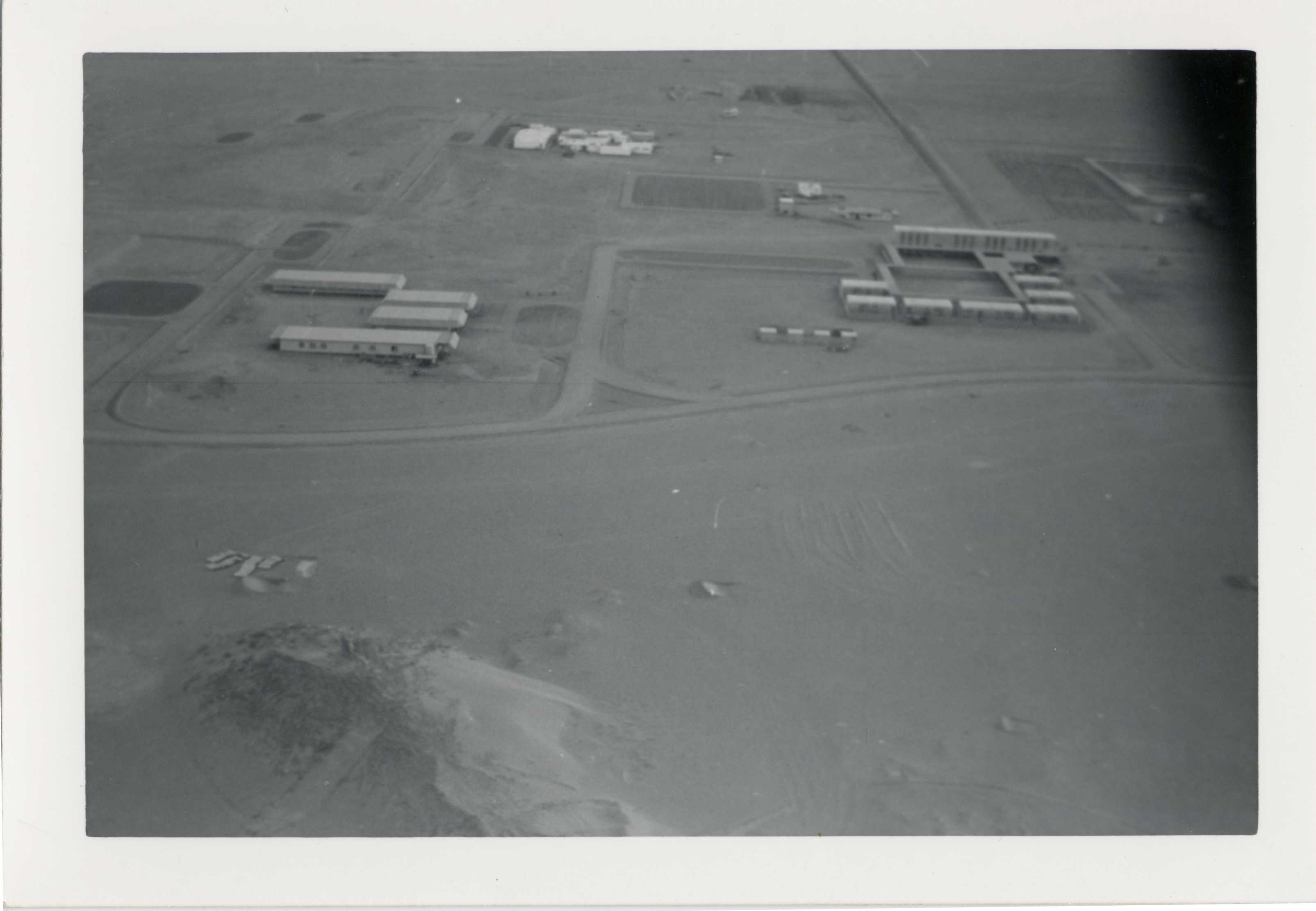 Vue aérienne de divers bâtiments dans le désert : centre administratif, hôtel, zone résidentielle.