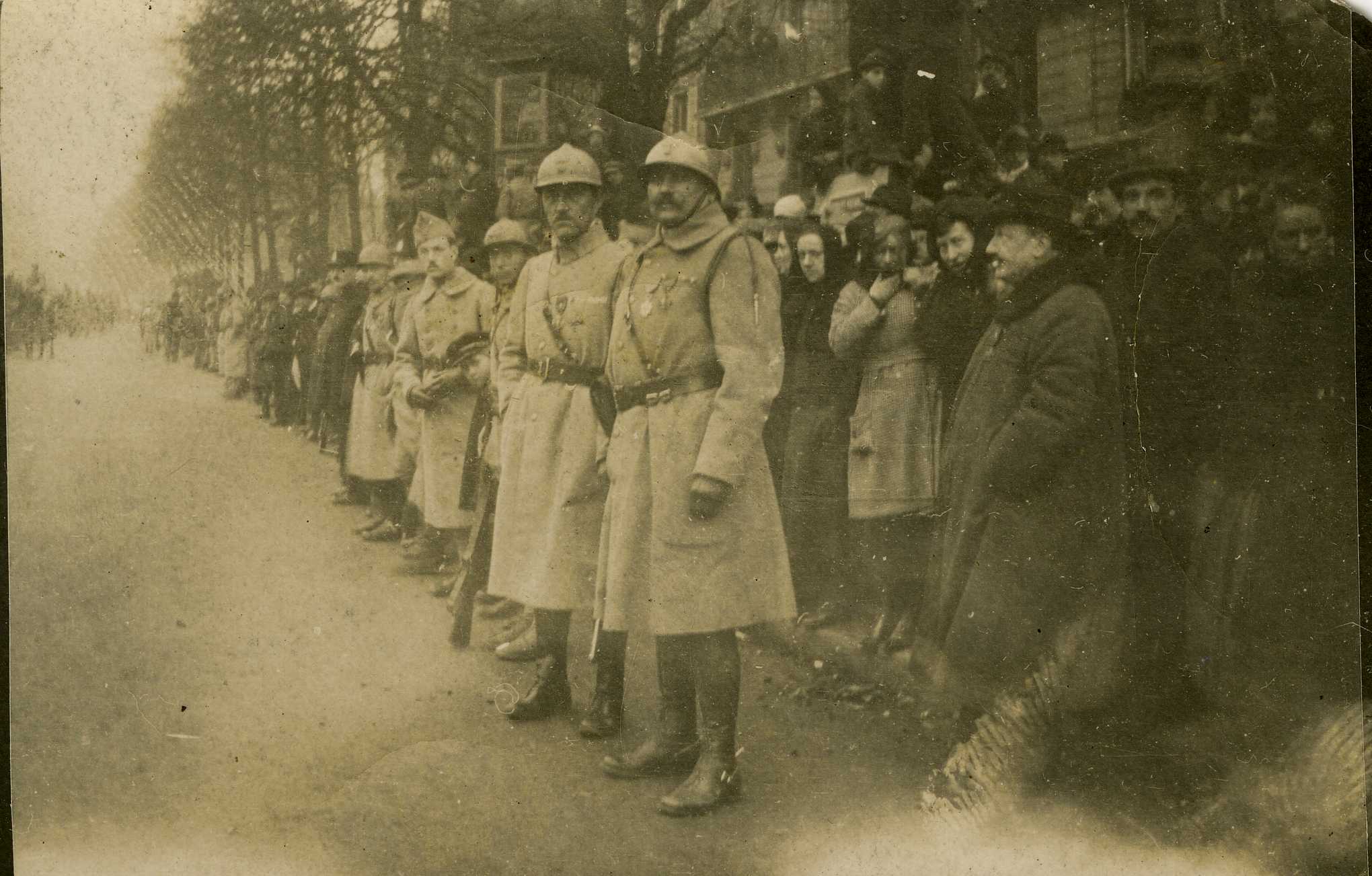 Soldats et civils assistent à un défilé pendant la Première Guerre mondiale.