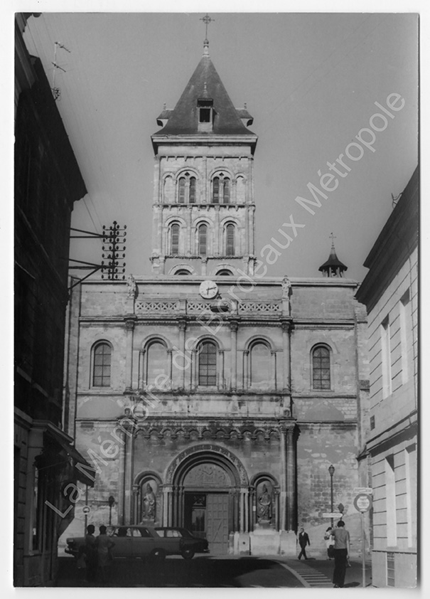 Vues de la façade de la basilique Saint-Seurin prise du bas de la rue Georges Mandel avec son porche roman.